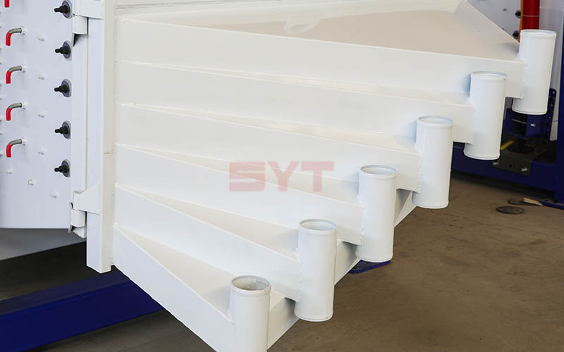 l 进料口:改变了原来依附在后门上的设计,增加了分料板结构,使分料更有效均匀.后门的重量减轻,让进料一端的摇摆运动更有力,使得投入筛面的物料更快速的分散筛分。